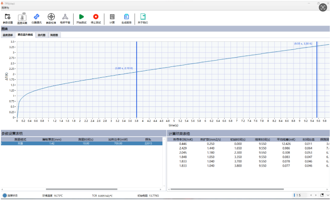 测试过程中温升曲线连续平滑,无明显噪声或异常拐点,表明传感器与样品接触状态良好。对有效时间区间内的数据进行拟合计算,得到该PCB板样品的等效导热系数为: