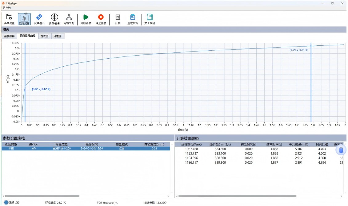 测试过程中温升曲线连续平滑,拟合区间清晰,无明显异常波动,表明测试装夹状态稳定。通过对有效时间区间内数据进行拟合计算,得到该石墨烯膜样品的面内导热系数为: