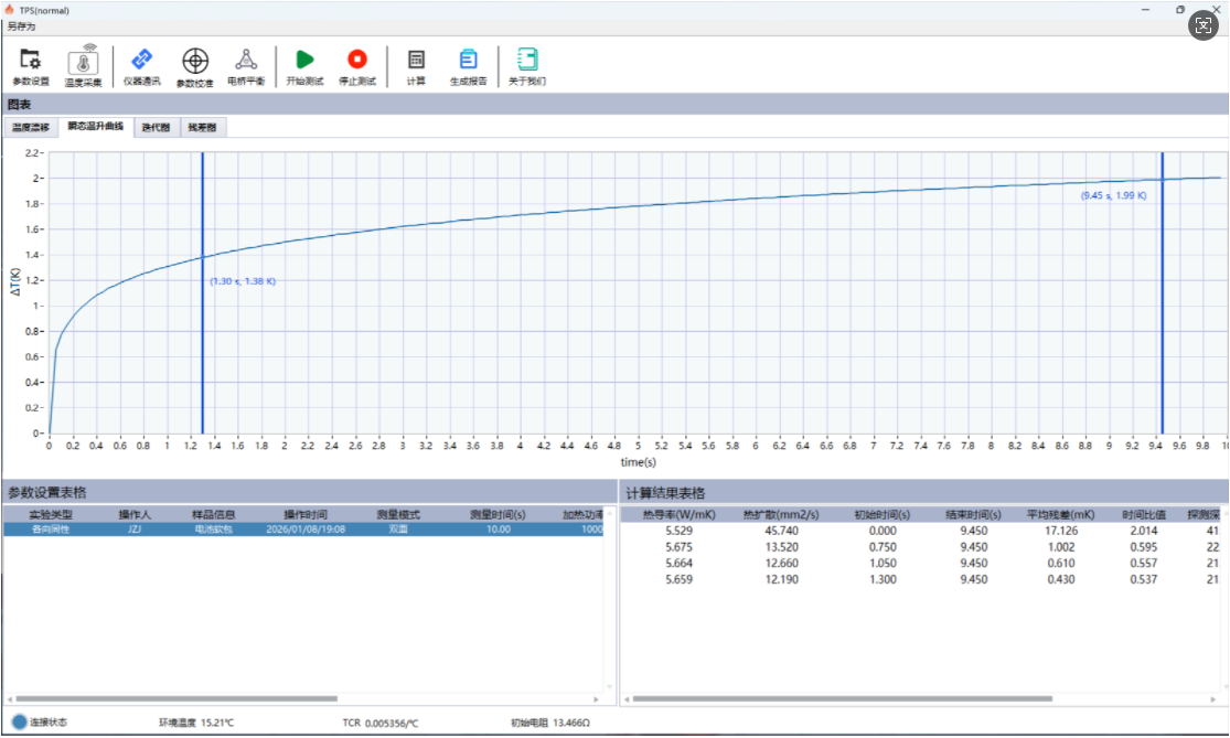 相较单一材料,软包电池更接近一种多层复合结构体系。传统稳态测试方法在制样和测试过程中往往难以真实反映其整体传热行为。瞬态平面热源法可在短时间、小温升条件下,对软包电池进行整体等效导热性能测试,适合用于工程热管理评估。